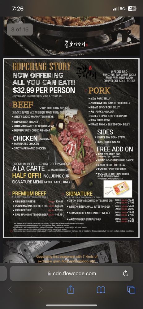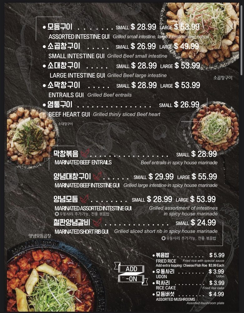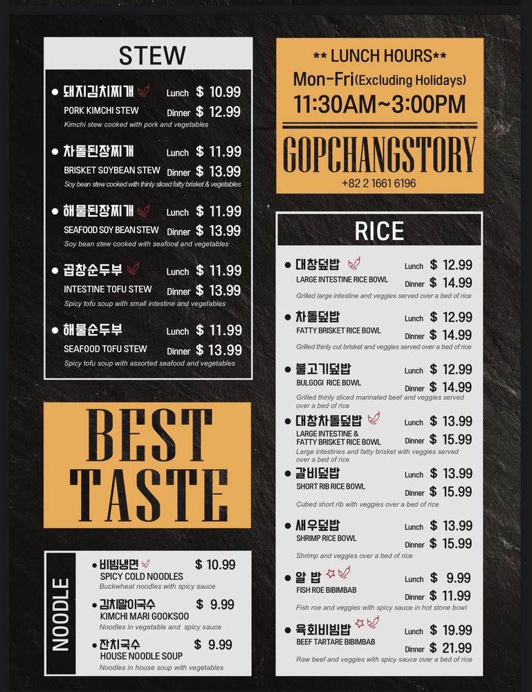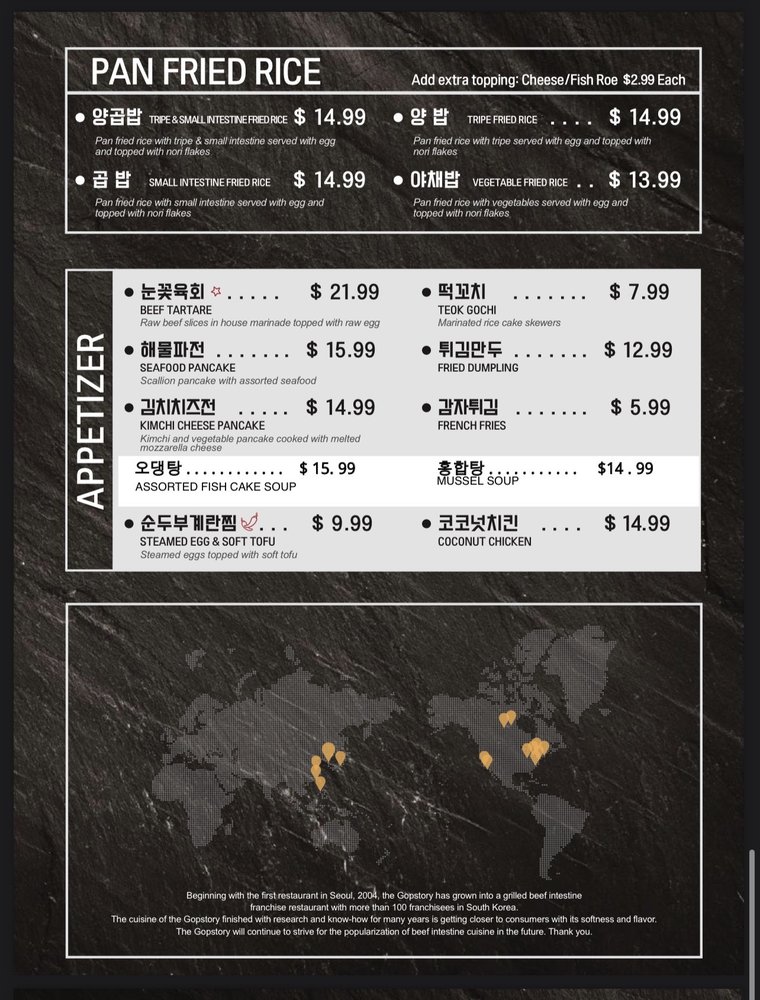 Welcome to Gopchang Story - Centreville, where authentic Korean cuisine comes alive! Nestled at 13830 Lee Hwy Ste 17 and 18, Centreville, VA, this trendy spot is committed to delivering a unique dining experience focused on quality. The menu showcases a delightful array of traditional dishes, with a special emphasis on gopchang, or grilled beef intestines, perfectly seasoned and expertly charred to achieve a savory depth.